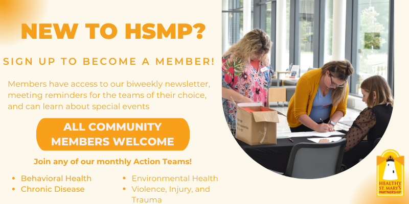 The Healthy St. Mary’s Partnership (HSMP) is a community-driven coalition of partners working together to improve health in St. Mary’s County, Maryland. The coalition mobilizes members through four action teams to address the priority health issues in St. Mary’s: Behavioral Health, Chronic Disease Prevention, Environmental Health, and Violence, Injury, and Trauma. Joining the Healthy St. Mary’s Partnership is free and all interested organizations and community members are welcome! Visit Membership for more information. Sign up for the free HSMP Newsletter for updates from the Action Teams and local health improvement news!